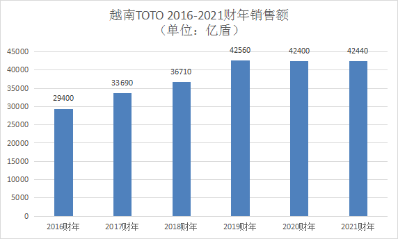 數(shù)據(jù)顯示,TOTO近年在越南的銷售額整體平穩(wěn)。2019財年突破40000億盾(約人民幣12.00億元)后,2020、2021財年均在42000億盾以上,其中2021財年還是越南疫情反彈較嚴(yán)重的一年,這一年TOTO在越南的營業(yè)利潤大幅減少65%。不過,正如TOTO建設(shè)第四工廠不僅為了越南市場,近年越南工廠的產(chǎn)品也大量出口海外市場。以2021財年為例,這一年TOTO在越南的銷售額為42440億盾(約人民幣12.73億元),其中外部顧客銷售額達到14390億盾(約人民幣4.32億元),占比超3成。