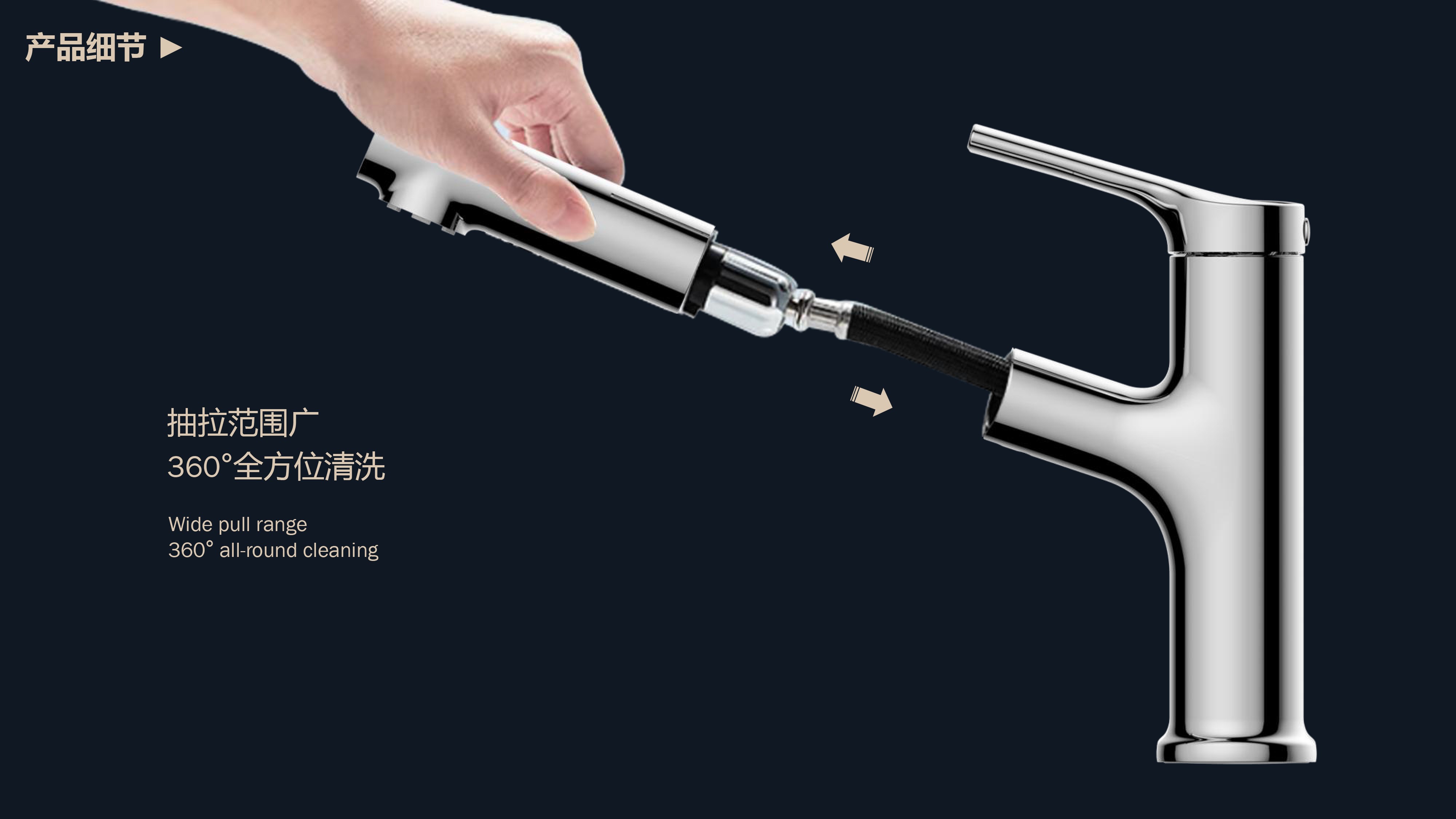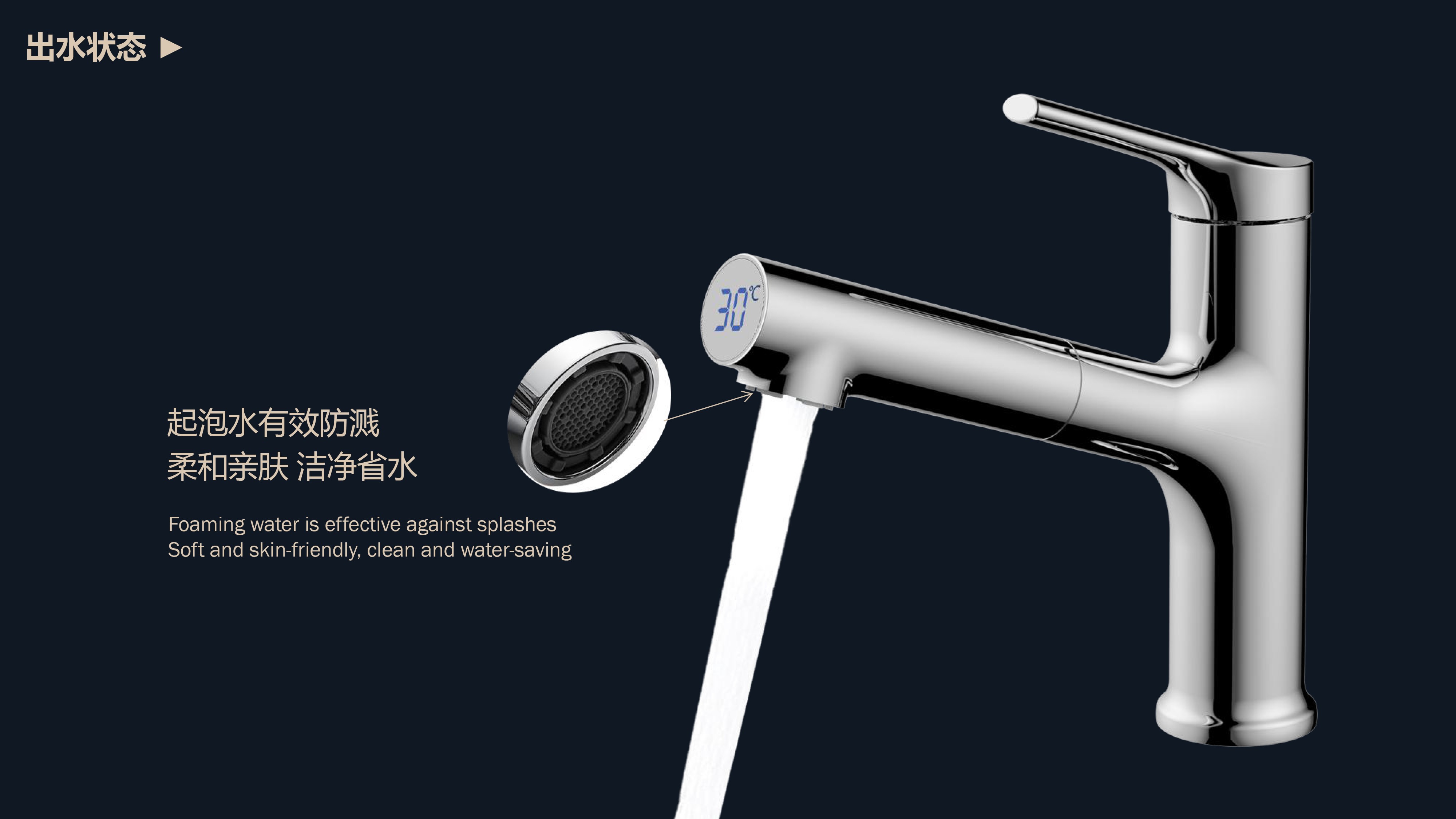 出水溫度實時看得見,解鎖龍頭舒適用法;抽拉范圍廣,360°全方位清洗;日常洗頭利器,龍頭抽拉出水輕松洗;氣泡水有效防濺,柔和親膚,潔凈省水;重力錘復位系統(tǒng),順暢伸縮,精準回位