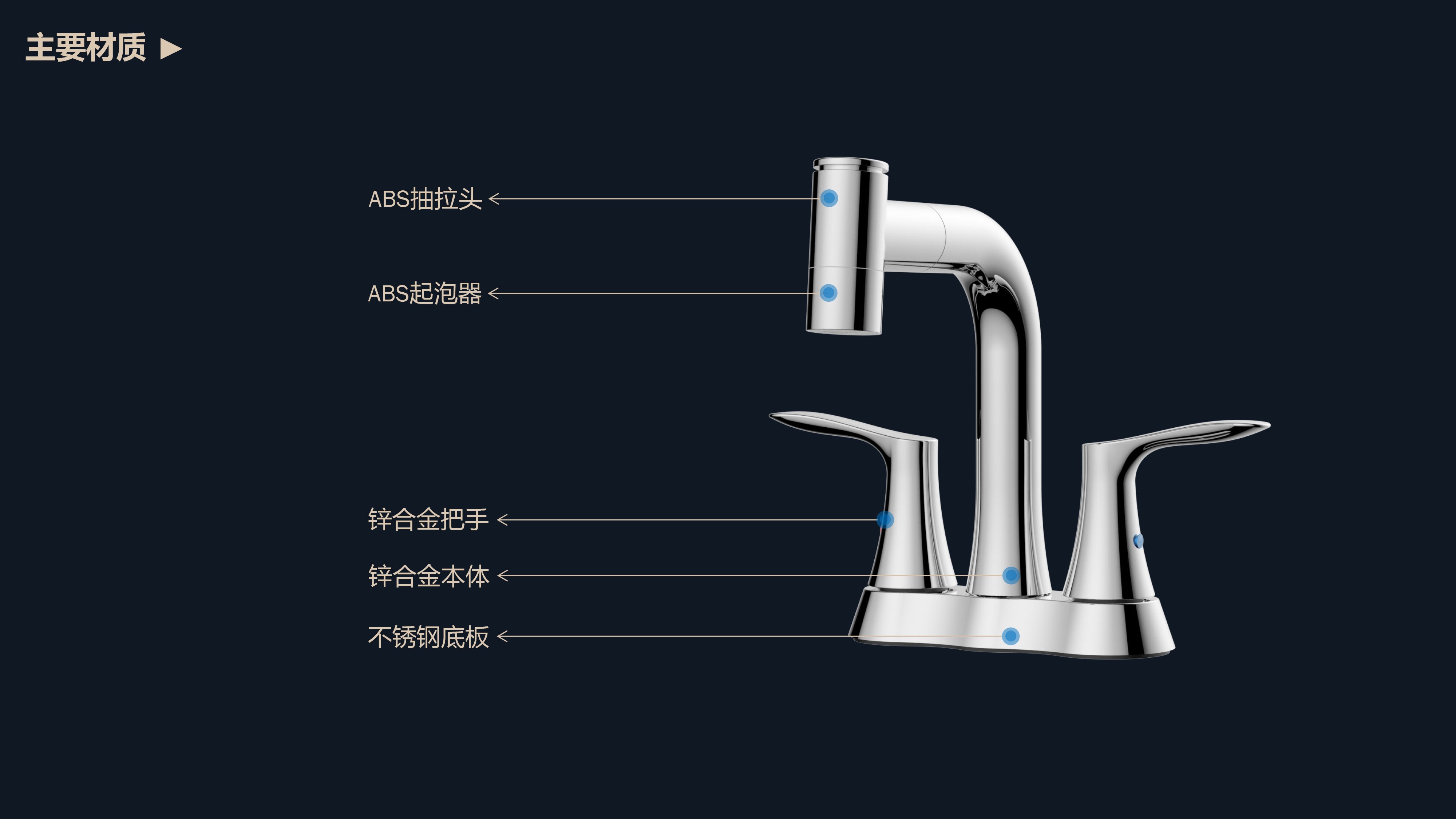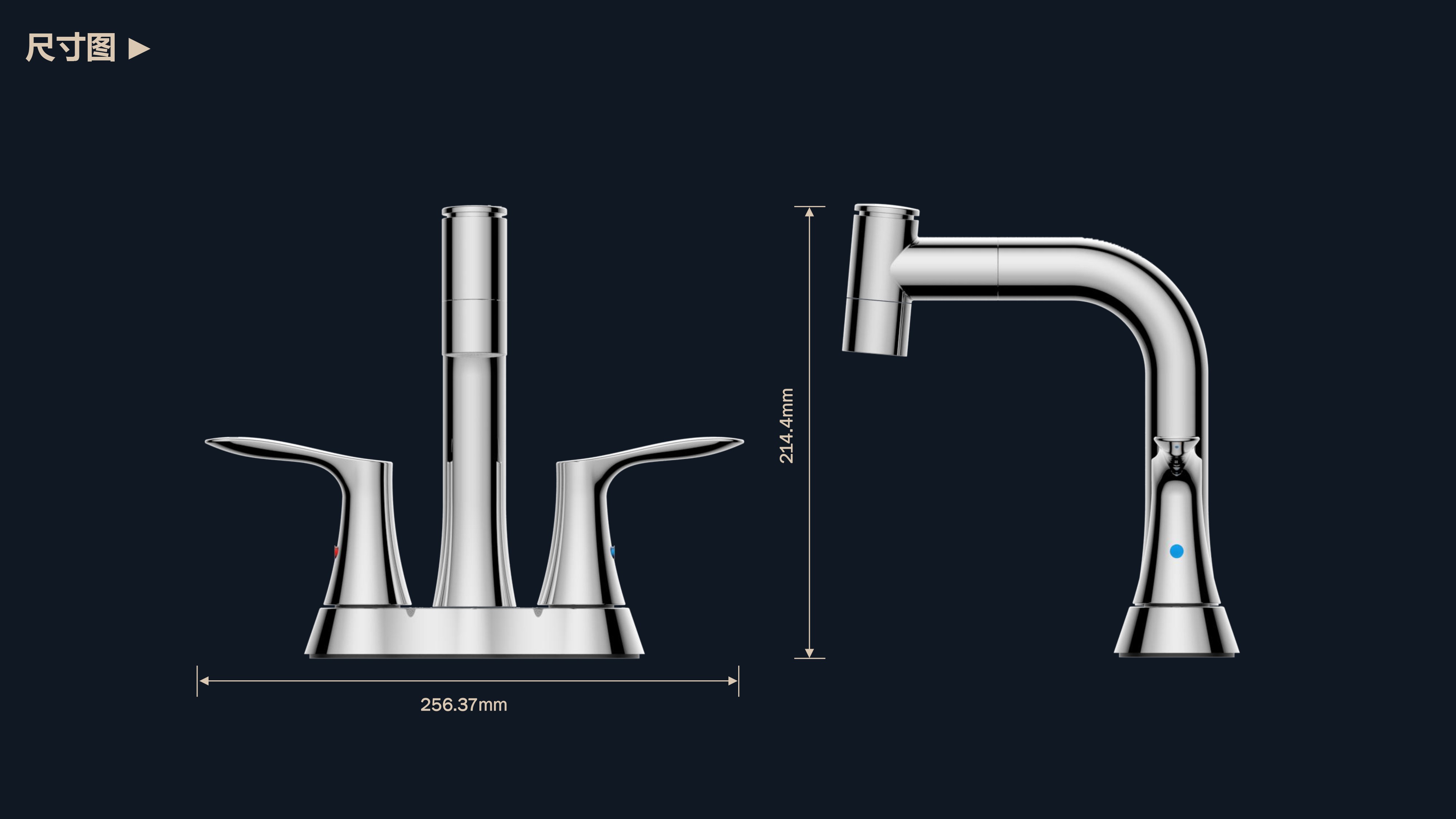 溫感三色LED燈光出水;日常洗頭利器,抽拉出水輕松洗;按壓切換兩功能水花;適合4寸3孔安裝臺面